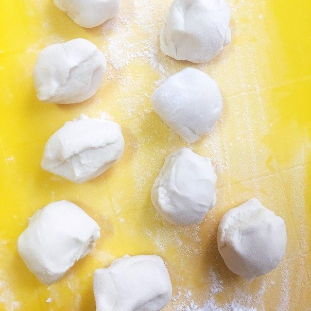 5、將揉好的面團(tuán)放在案板上,搓成長(zhǎng)條形狀,切成幾個(gè)小劑子,稍微大一點(diǎn),做出來(lái)的麻團(tuán)就稍微大點(diǎn),喜歡吃餡的可以根據(jù)自己喜好加點(diǎn)豆沙或者不加都可以。